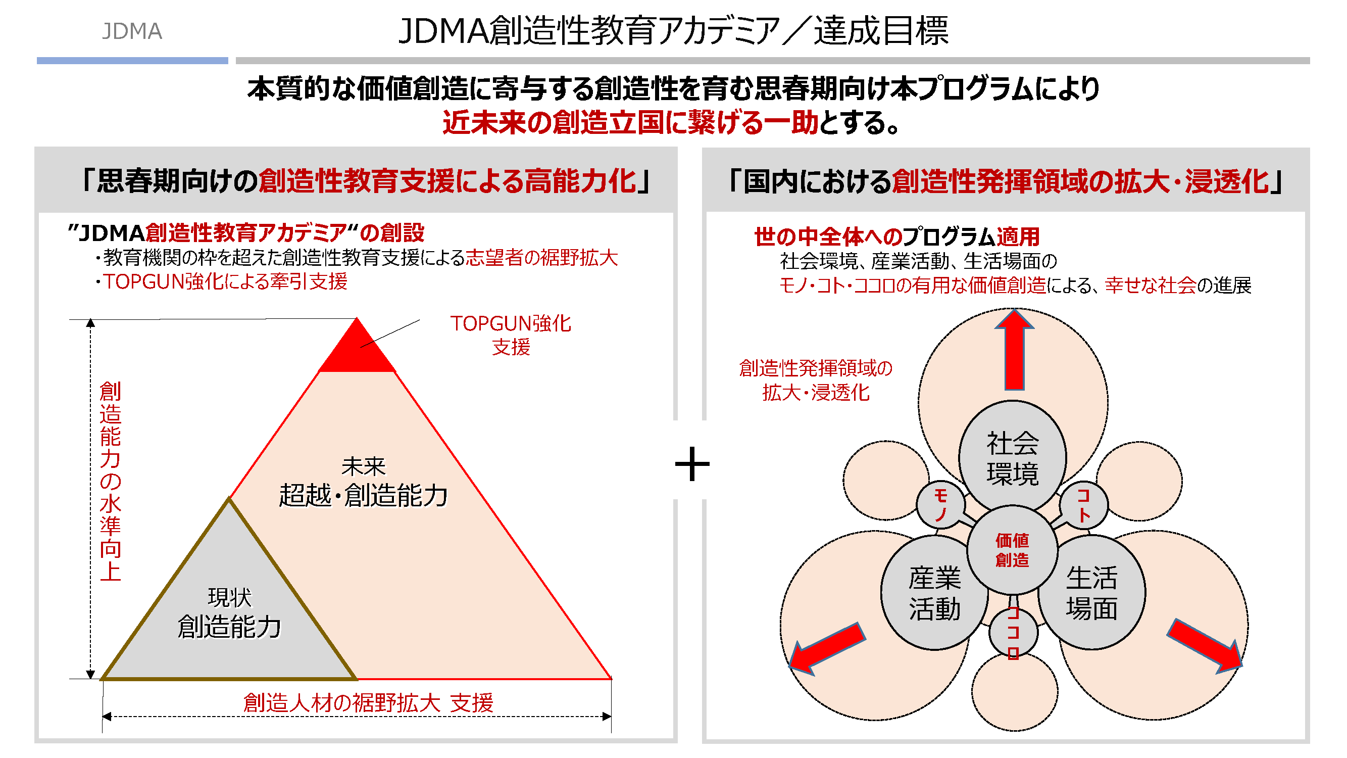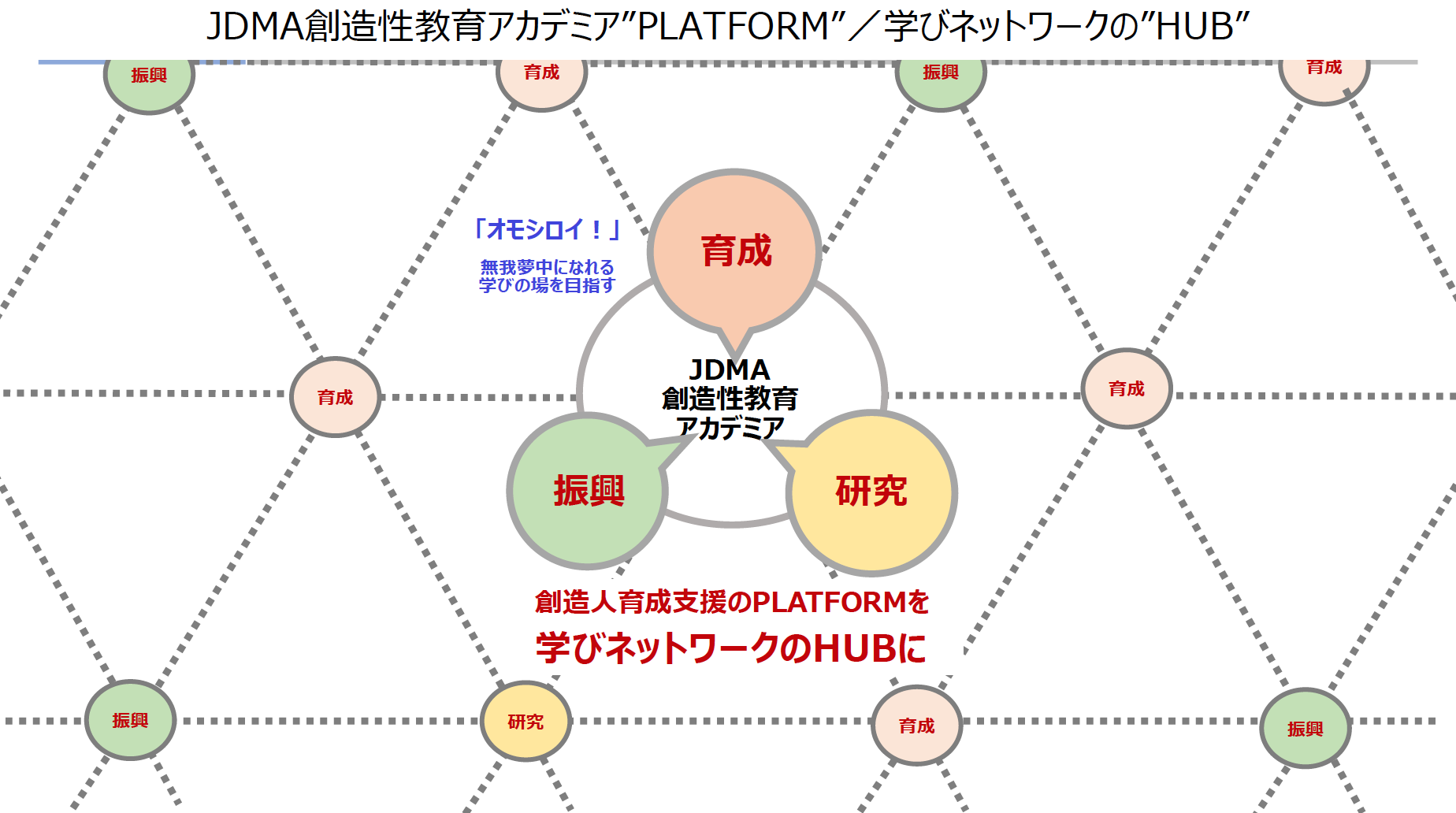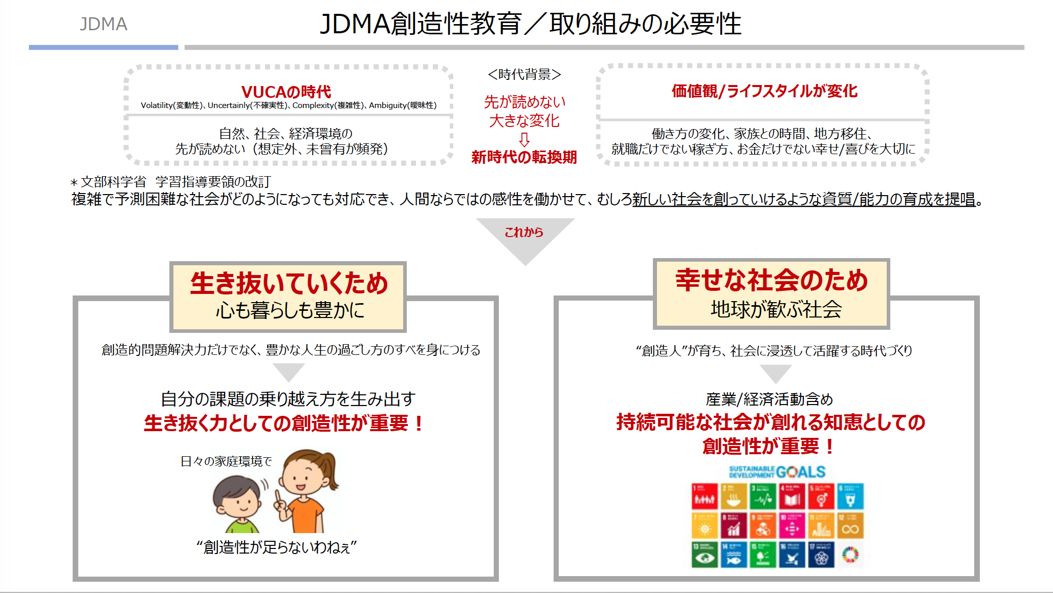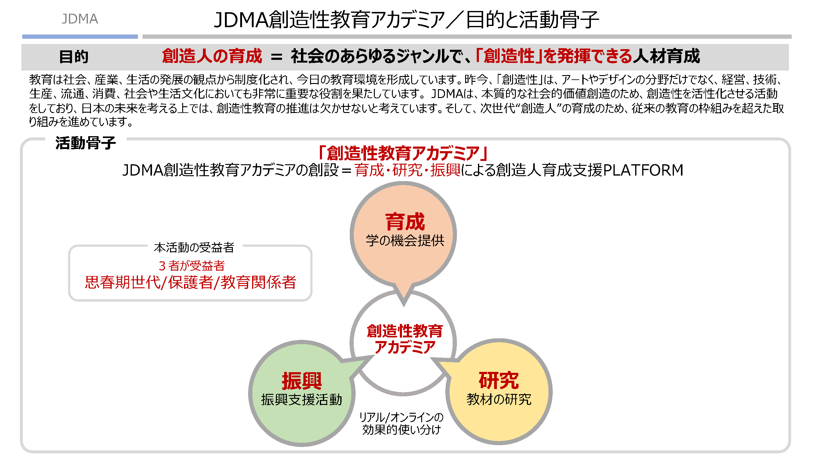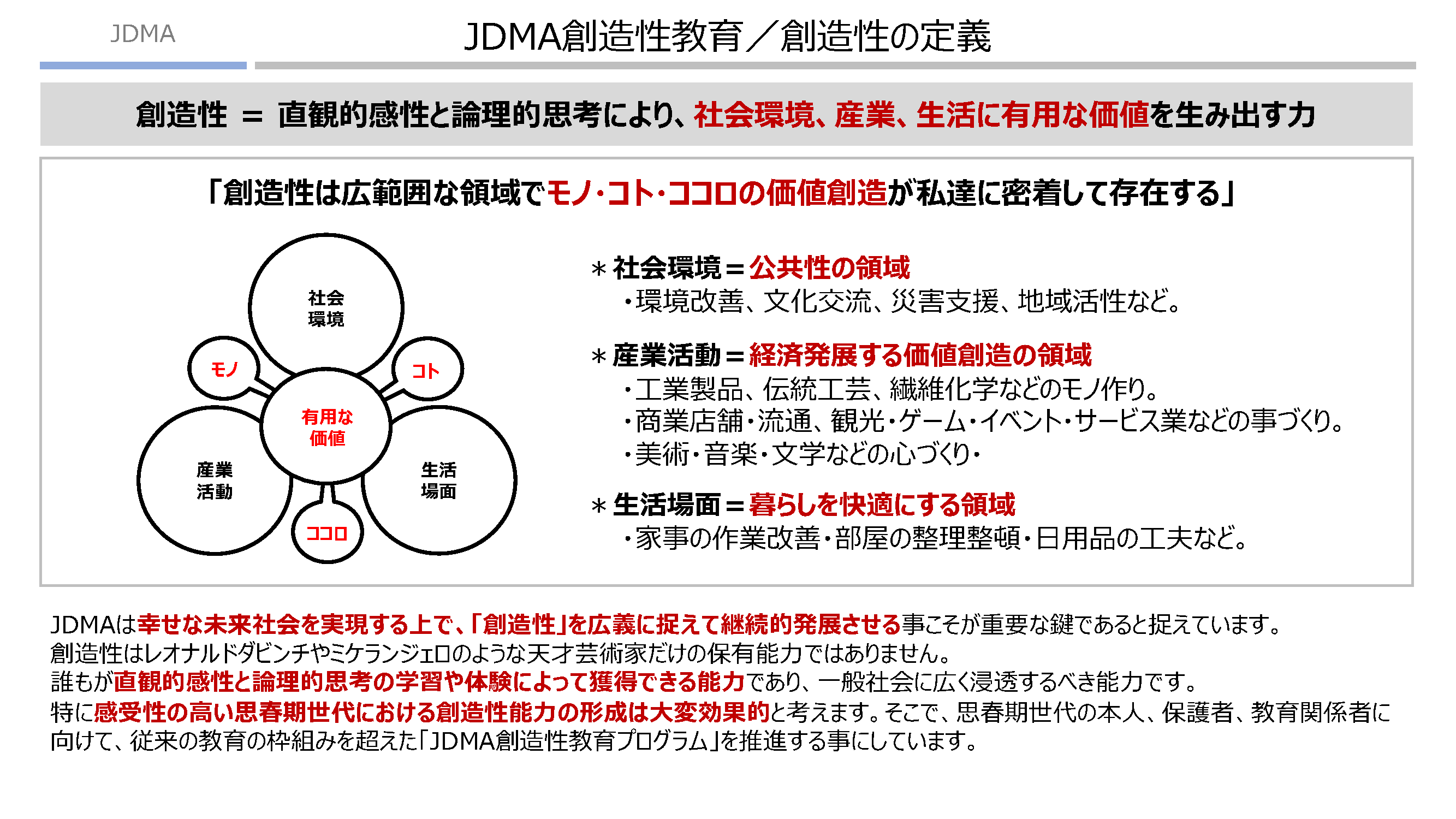 教育は社会、産業、生活の発展の観点から制度化され、今日の教育環境を形成しています。昨今、「創造性=独創性と有用性」は、アートやデザインの分野だけでなく、経営、技術、生産、流通、消費、社会や生活文化においても非常に重要な役割を果たしています。 JDMAは、本質的な社会的価値創造のため、創造性を活性化させる活動をしており、日本の未来を考える上では、創造性教育の推進は欠かせないと考えています。そして、次世代“創造人”の育成のため、従来の教育の枠組みを超えた取り組みを進めています。