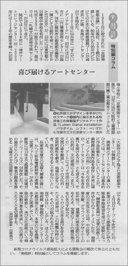 宝塚市立文化芸術センターのオープンが4月19日(日)でしたが、新型コロ大のため延期になりました。併せて「開館記念展:宝塚の祝祭1」も延期となりました。宝塚市立文化芸術センター館長で美術評論家の加藤義夫氏(JDMA理事)が朝日新聞大阪本社版に記事「喜びを届けるアートセンター」を執筆しました。